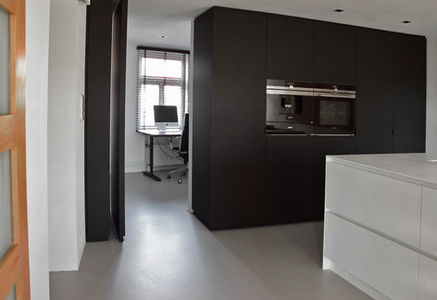 Bij het ontwerp van deze moderne keuken is eerst goed gekeken naar de ruimte. Achter de keuken zat eerst een badkamer. Door het doorbreken van de muren is de ruimte aanzienlijk vergoot. De ruimte is zo efficiënt en functioneel mogelijk ingedeeld. Dit is mogelijk door het ontwerp van de keuken te laten realiseren door een interieurbouwer die deze op maat heeft gemaakt. Achter de kastenwand bevindt zich de bijkeuken. Deze wordt pas zichtbaar als de deur van de kastenwand geopend is. De taatsdeur in gesloten stand gaat op in de keukenwand waardoor de deur niet meer zicht is en een 'geheime' doorgang wordt. Zodra de taatsdeur openstaat fungeert deze als een element die de twee ruimtes met elkaar verbindt.