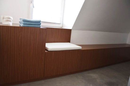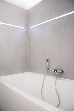 De ruimte was extra uitdagend door de vele hoeken en schuine wanden. Hierom is er gekozen om van de wanden af te werken doormiddel van twee wanden in de vorm van een T midden in de ruimte te plaatsen. Hierdoor kunnen de elementen in de badkamer beter geplaatst worden en wordt de functionaliteit behouden. Door indirect licht te plaatsen op de T-vorm wordt dit element nog meer versterkt. De sfeerverlichting die over de wanden van de T langs elk element loopt zorgt voor extra sfeer.